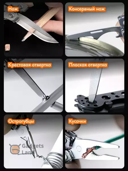 Инструменты: Плоскогубцы, Пилка для ногтей, Отвертка крестовая, Отвертка плоская, Нож прямой, Открывалка для бутылок, Открывалка для консервов, Ножницы